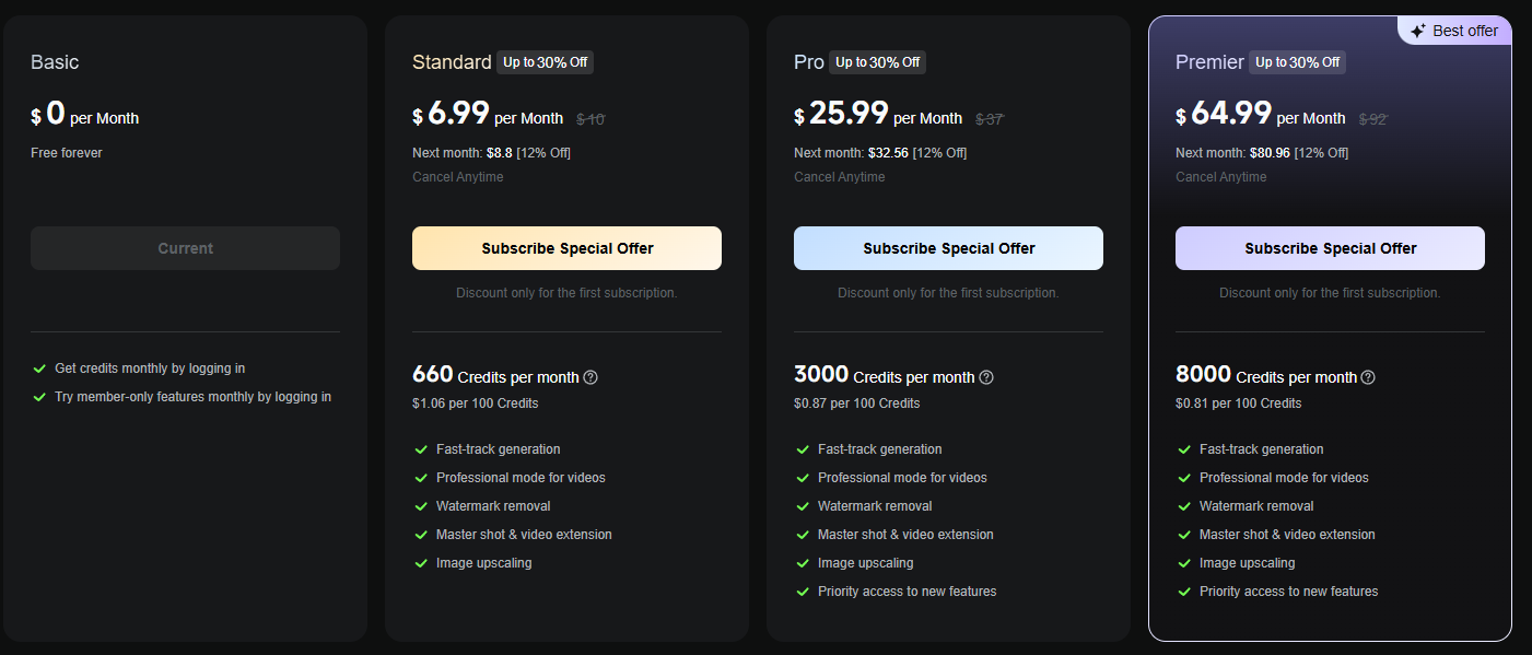 | Standard | $6.99~10 | 월 660 크레딧 | 워터마크 제거 / 기본 해상도 |