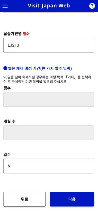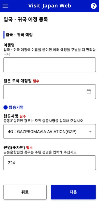 7. 여행명은 자유롭게 작성 후 일본 도착 예정일과 항공사명 및 편명을 입력해주세요.