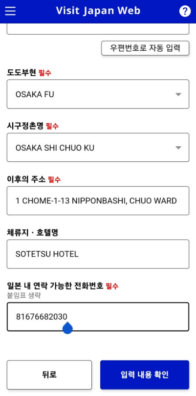 - 🏨 숙소 정보 (첫날 호텔 이름, 주소, 전화번호, 우편번호)
