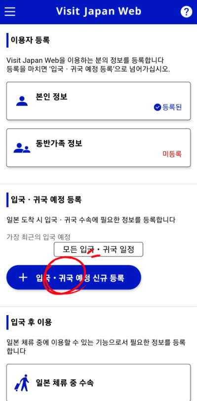 6. 홈으로 돌아가기 선택 - 입국,귀국 예정 등록을 클릭합니다.
